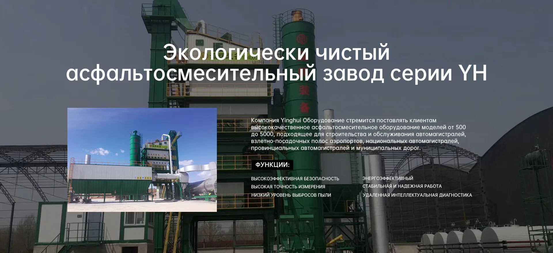 Хэнань Инхуэй Механическое оборудование Общество с ограниченной ответственностью является профессиональным производителем дорожно-строительной техники, объединяющим научные исследования, разработки, производство, изготовление и продажи. Компания обладает мощным техническим потенциалом и независимыми научно-исследовательскими и опытно-конструкторскими возможностями, а также имеет тринадцать патентов на полезные модели и шесть авторских прав на компьютерные программы. Компания успешно прошла сертификацию системы качества ISO9001, сертификацию системы охраны окружающей среды ISO14001 и получила сертификат EAC (Совет по электротехнике и электронике) Российской Федерации. В 2018 году компания также получила сертификат CE Европейского Союза. Продукция получила широкое признание клиентов благодаря своей высокой эффективности, надежности, безопасности и экологичности. Основная продукция компании включает в себя: 1. Оборудование для смешивания асфальтобетонной смеси серии YH; 2. Комплексное оборудование для регенерации асфальтобетонной смеси серии YHR; 3. Оборудование для переработки асфальтобетонной смеси серии RLBS; 4. Оборудование для смешивания асфальтобетонной смеси барабанного типа YHT; 5. Оборудование для смешивания стабилизированного грунта YHW. Компания оказывает мощную поддержку строительству высококачественных автомагистралей.